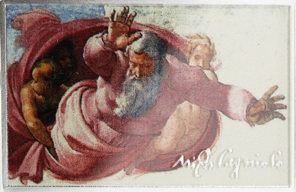 Michelangelo's "Separation of Land and Water" detail, with signature, from the Sistine Chapel ceiling.