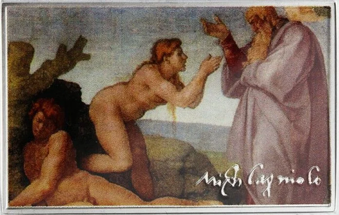 Detail of Michelangelo's "The Creation of Eve" on the Sistine Chapel ceiling, with his signature at lower right.