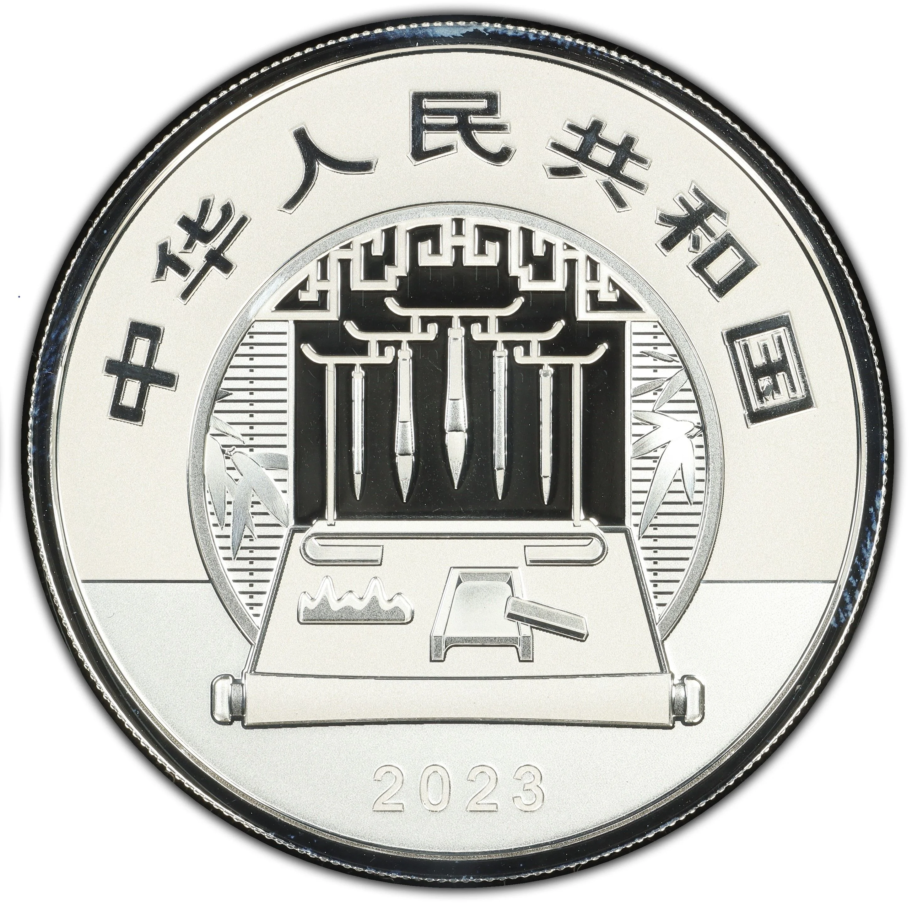Brushes, ink, paper, and an inkstone among bamboo leaves, framed by a lattice window with the PRC title and year.