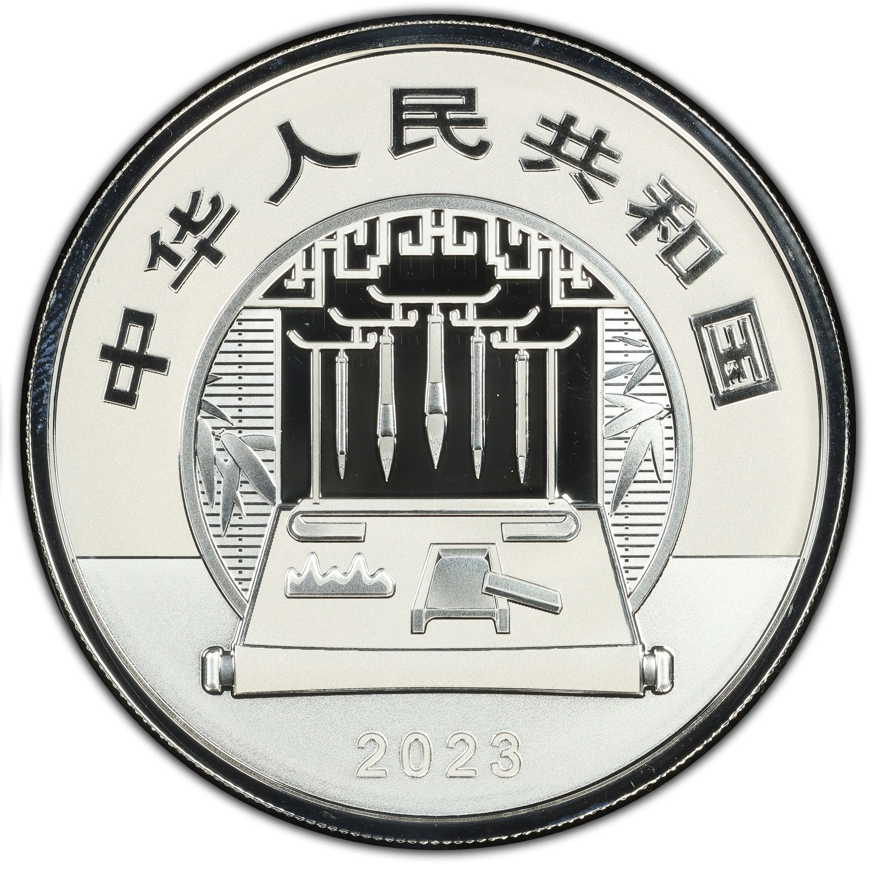 Brushes, ink, paper, and an inkstone among bamboo leaves, framed by a lattice window with the PRC title and year.