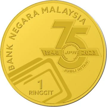 Description: The top circumference reads "JABATAN PENDAFTARAN NEGARA" and the bottom "JUBLI INTAN". The design, reflecting JPN's modernization, centers on a fingerprint encircled by icons symbolizing its management of birth, identity, marriage, citizenship, and death records.