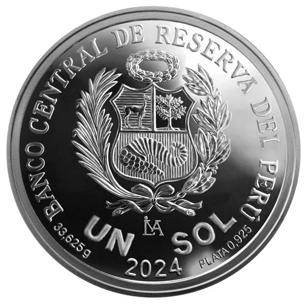 Featuring a bust of a Húsares de Junín cavalryman and the Monument to the Victors of Junín, the coin is bordered by the legend "BICENTENARY OF THE BATTLE OF JUNÍN" and the dates "1824 - 2024".