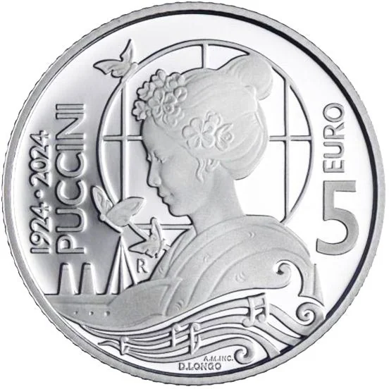 Collage for Madama Butterfly: Cio-Cio-San's profile against a shoji screen, surrounded by butterflies. Pinkerton's ship is at lower left, with waves and floating musical notes below.