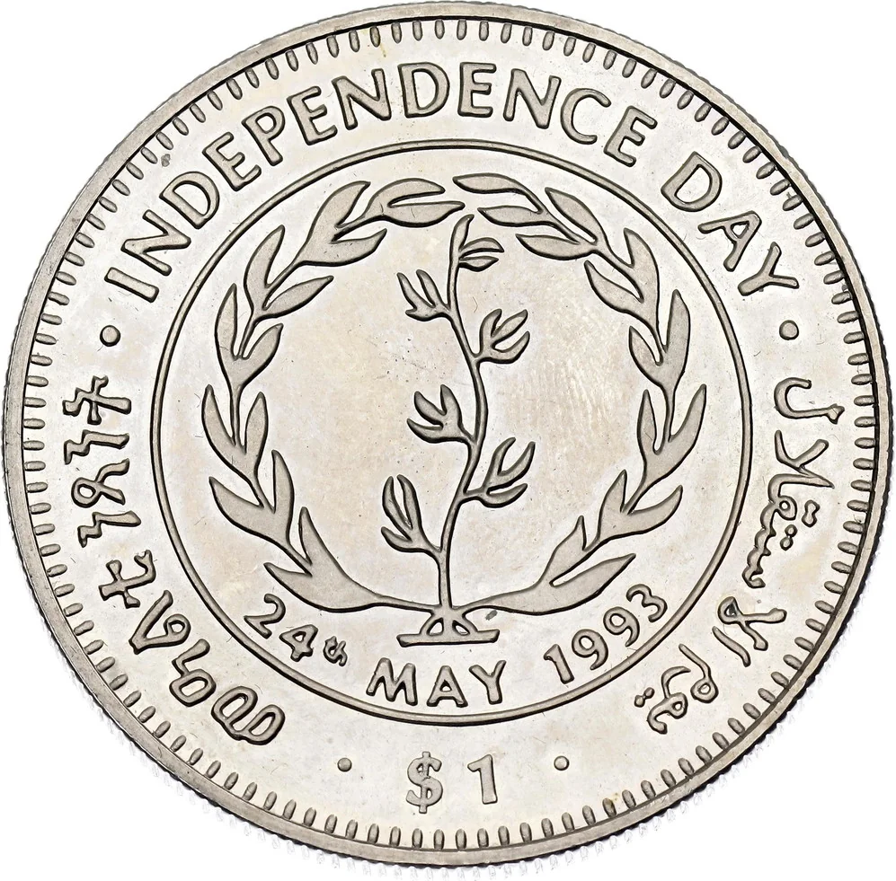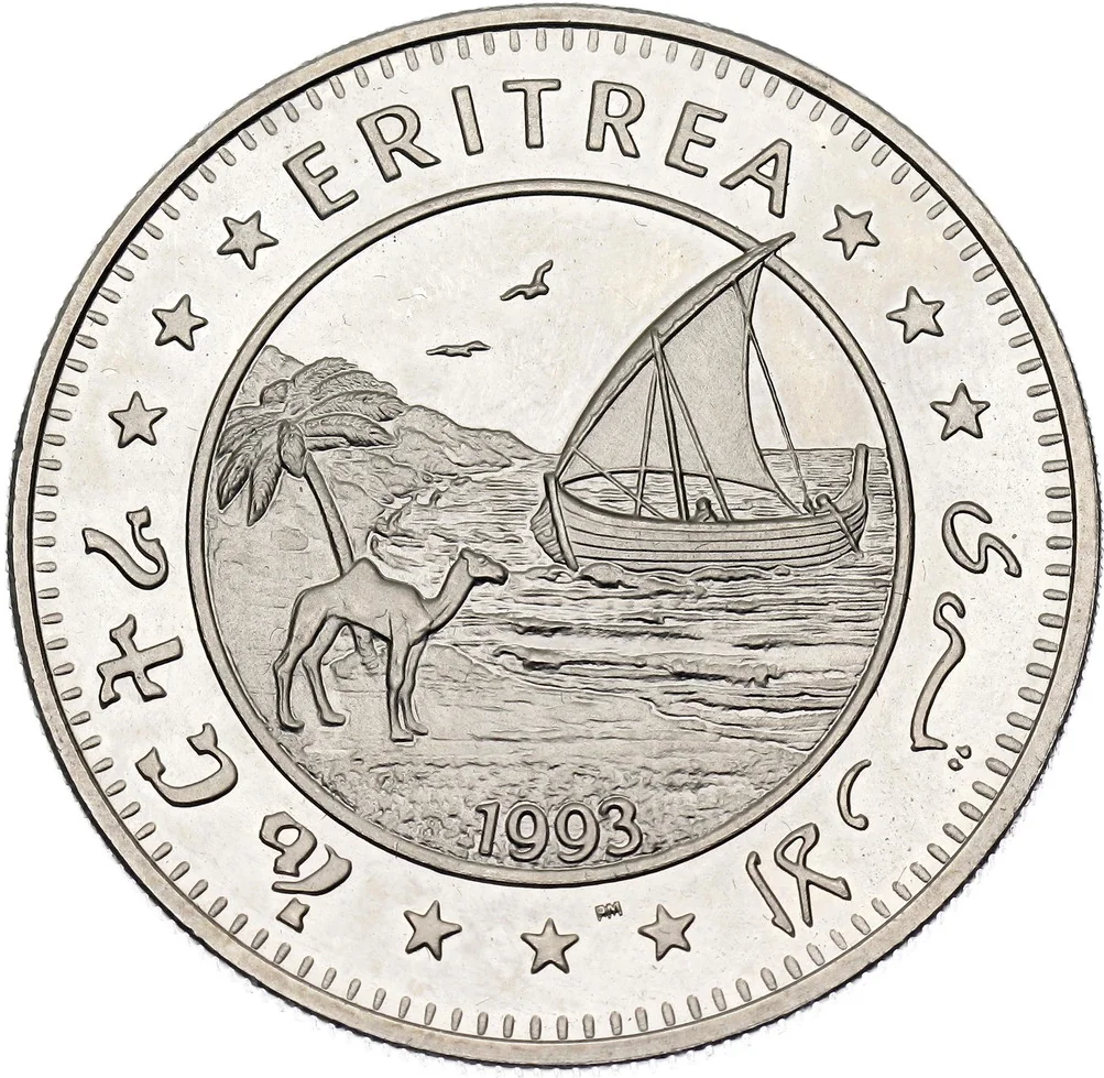Palm, camel, and dhow in a circle. Tigrinya, English, and Arabic legend on a toothed rim.