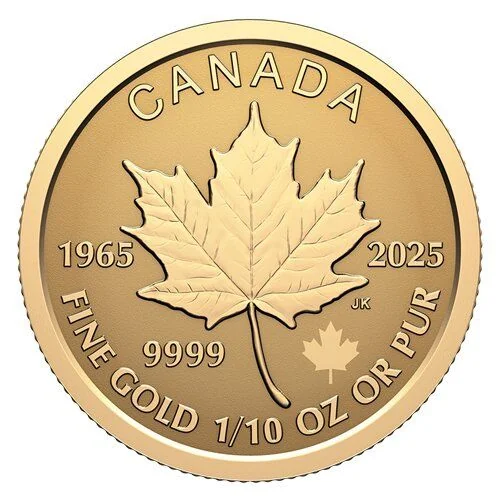 A sugar maple leaf with "1965" and "2025" marks the 60th anniversary of Canada's flag, accompanied by a privy mark of its 11-point leaf.
