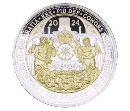 Description: Centered on the iconic Gold State Coach wheel, Tritons flank it, symbolizing Britain's naval command. The design features UK flowers, with the Royal Mews and its vaulted stable ceiling in the background.