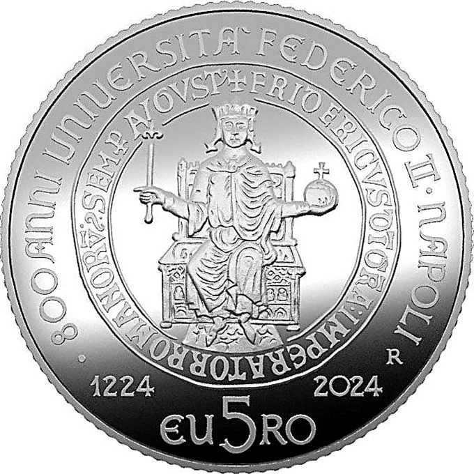 Central logo of "Federico II" University of Naples, encircled by "800 ANNI UNIVERSITÀ FEDERICO II NAPOLI". Flanking dates "1224" and "2024" below, with mint mark "R" on the right. Value "5 EURO" in exergue.