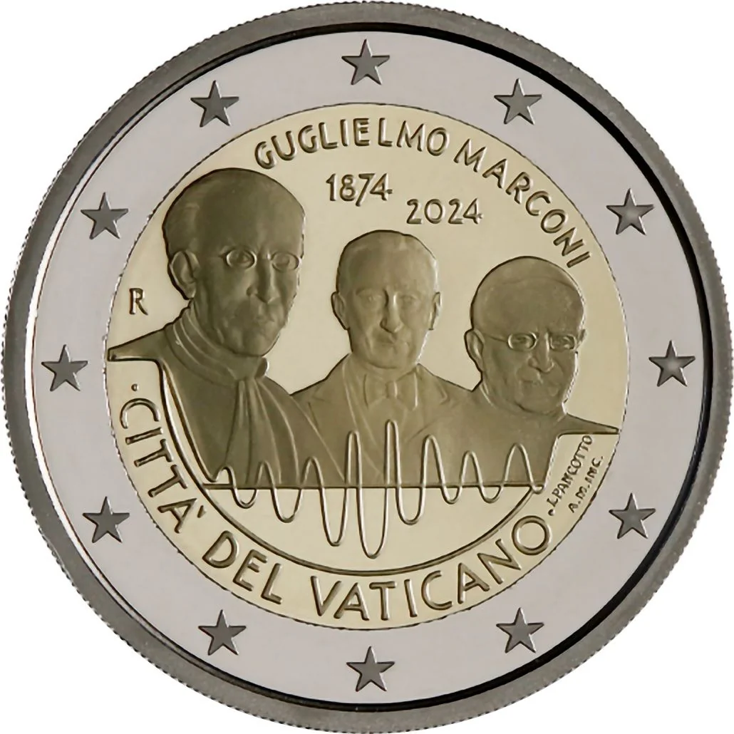Description: Marconi center, Pius XI right, future Pius XII left, above a radio wave. European stars surround on outer ring.
