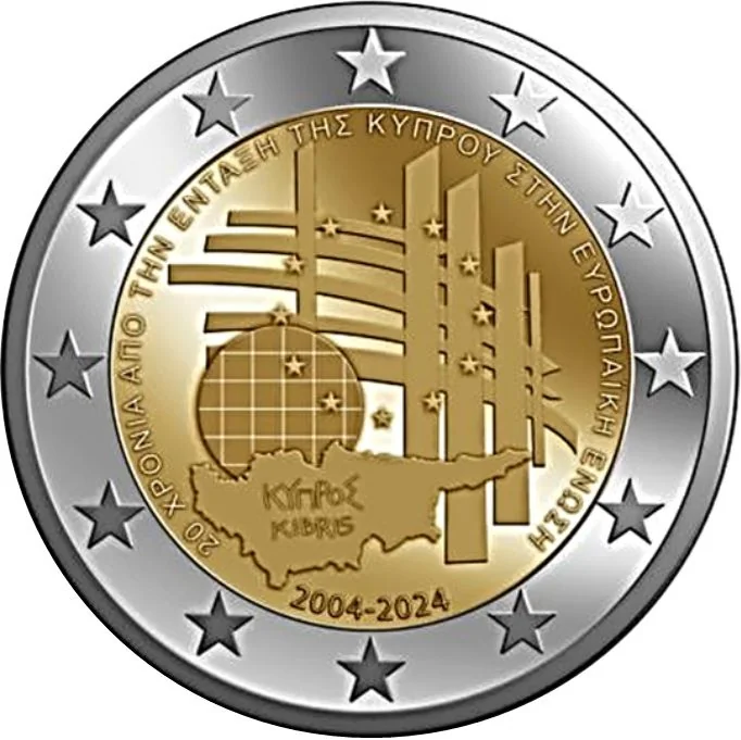 Description: A composition featuring Cyprus, the words “ΚΥΠΡΟΣ” and “KIBRIS”, a globe, the European Commission building, and the dates «2004-2024». The phrase «20 ΧΡΟΝΙΑ ΑΠΟ ΤΗΝ ΕΝΤΑΞΗ ΤΗΣ ΚΥΠΡΟΥ ΣΤΗΝ ΕΥΡΩΠΑΪΚΗ ΕΝΩΣΗ» encircles the design, with the EU's twelve stars on an outer ring.