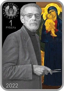 The center features a stylized self-portrait alongside his 1998 painting, "The Holy Mother of God."