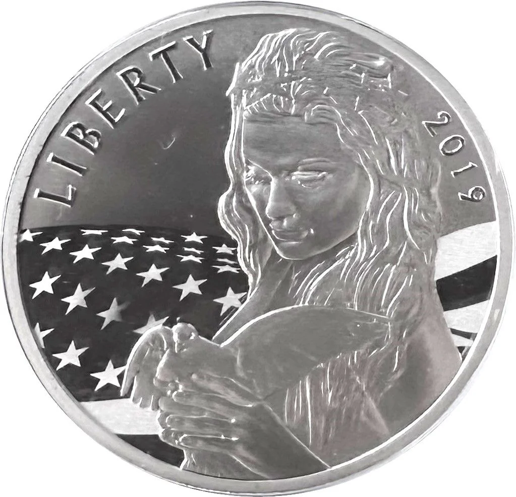 Lady Liberty cradles a dove of peace before a waving American flag.