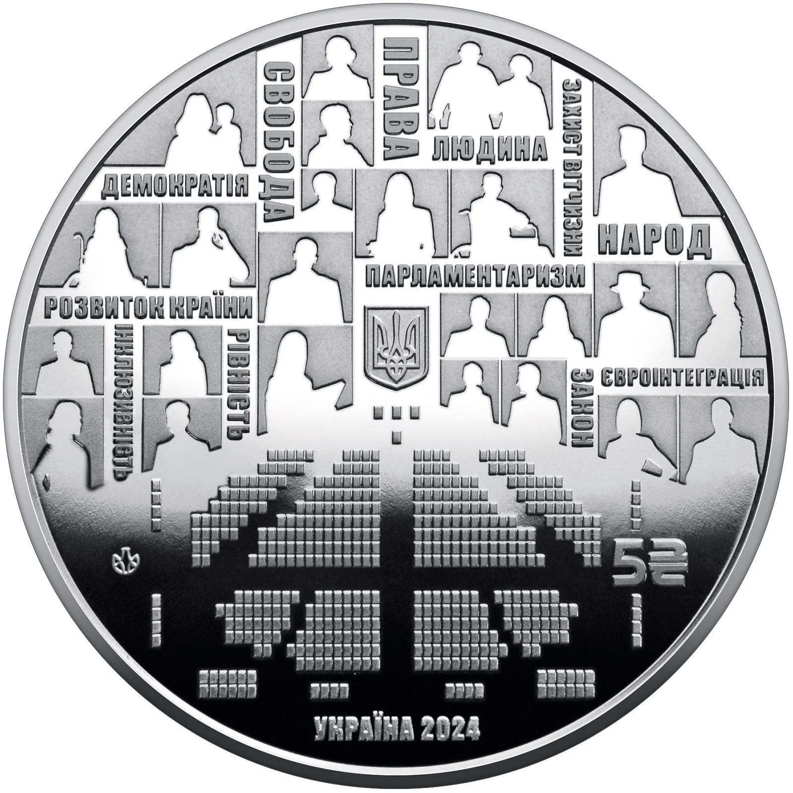 The coat of arms is encircled by stylized silhouettes representing modern Ukrainians of diverse backgrounds, interspersed with democratic principles. Below it, a display board shows voting results in the Verkhovna Rada session hall.