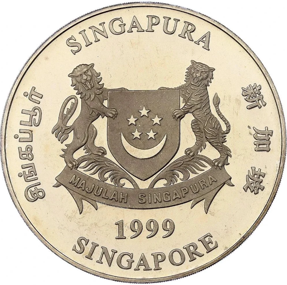 Emblem with date; 'Singapore' encircles it in English, Tamil, Chinese, and Malay.