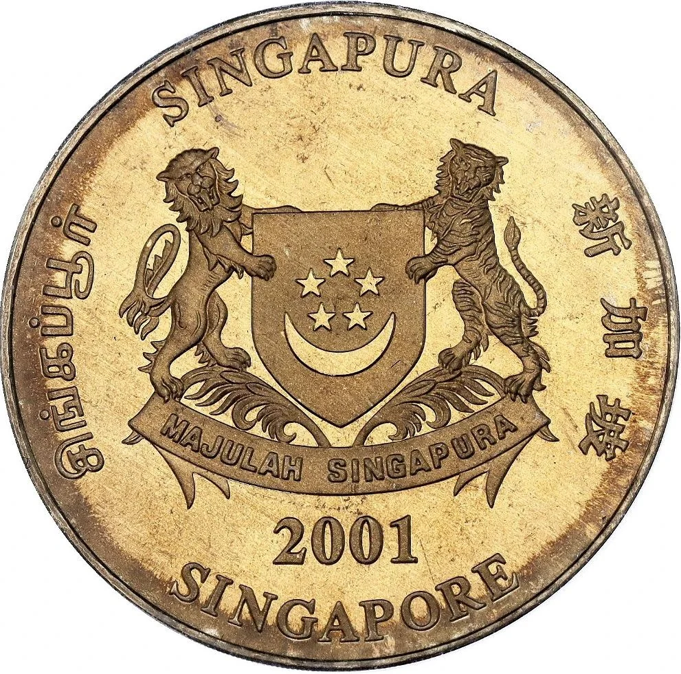Emblem with date; 'Singapore' encircles it in English, Tamil, Chinese, and Malay.