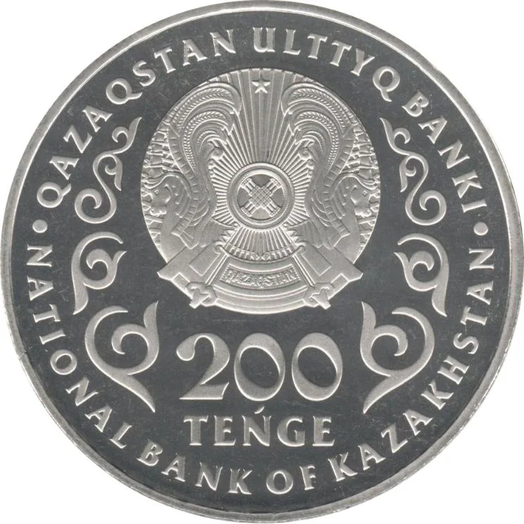 Description: Central: Kemel Akishev portrait. Left: "Golden Man" he discovered. Top: ARCHAEOLOGY. Right: Bank logo, issue year, anniversary, lifespan. Bottom: KEMEL AQYSHEV.