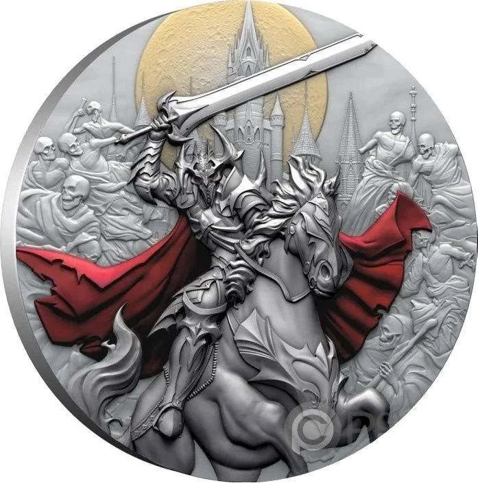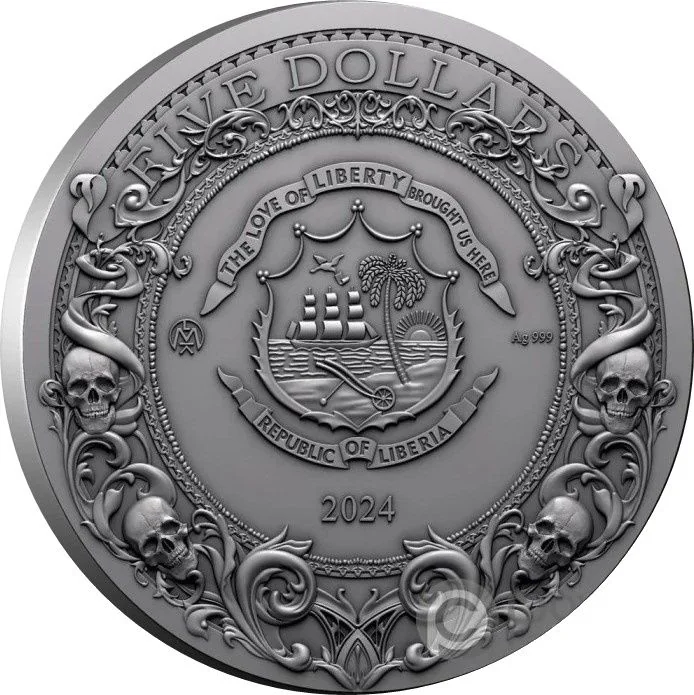 Coat of arms central, dividing mintmark and weight. Value above, date below, encircled by a wreath with skulls.