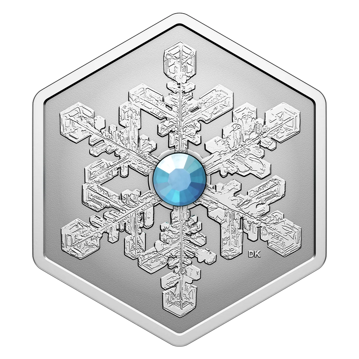 Your coin's reverse showcases a magnified stellar dendrite ice crystal, photographed by Don Komarechka and engraved by the Royal Canadian Mint. A proof finish highlights the crystal's six engraved branches and hexagonal shape, with a light blue centre adding a wintry sparkle.