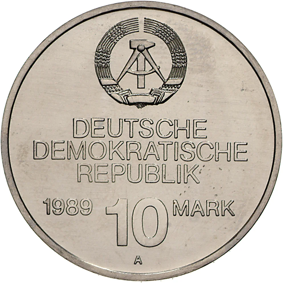 East German coat of arms above the country name; date left of value above mintmark.