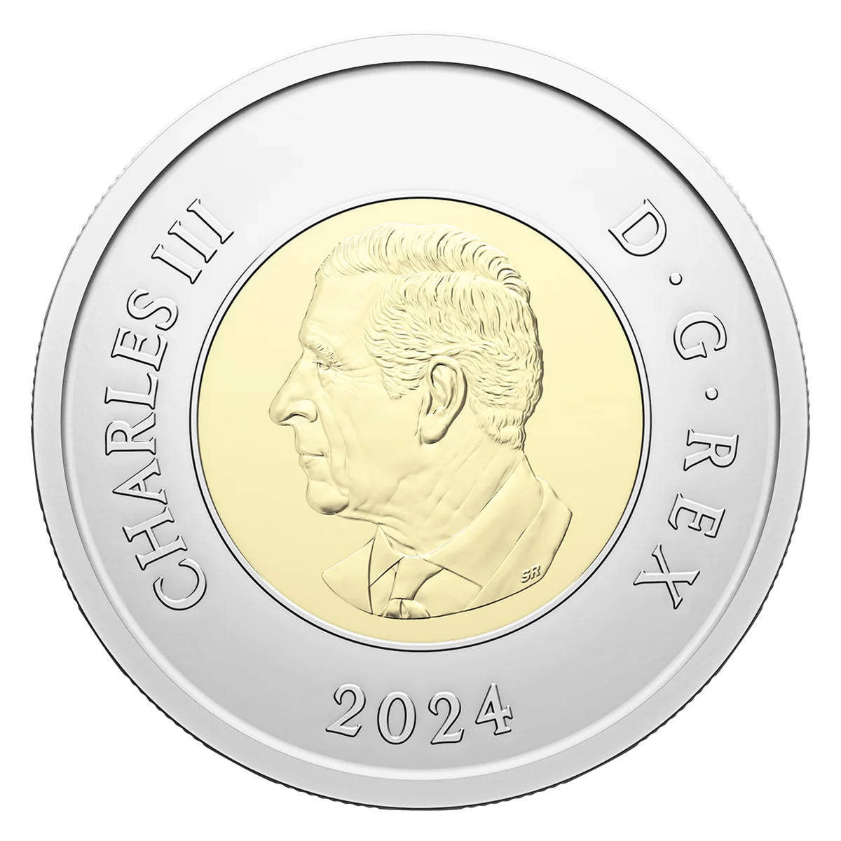 This coin's reverse marks 100 years of the RCAF, featuring stylized depictions of its aircraft. The central image shows the RCAF roundel above a CC-130 Hercules, angled upward in a nod to the RCAF motto. The dates "1924 2024" commemorate the centennial. Eight historical and current aircraft appear on the outer ring.