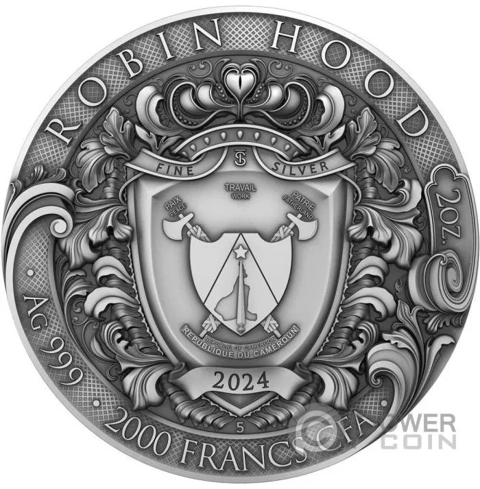 Cameroon's coat of arms on a shield, encircled by text.