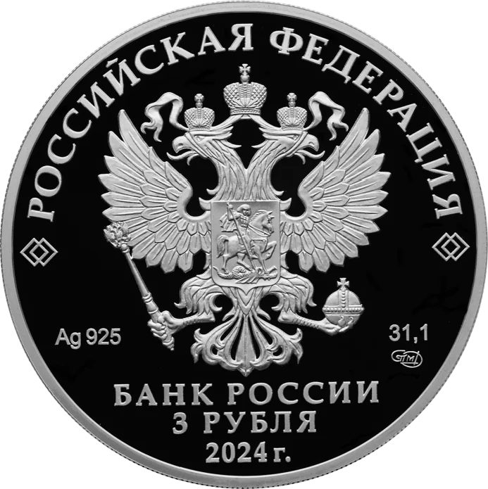 The obverse features the Russian coat of arms, inscriptions for "Russian Federation" and "Bank of Russia," the denomination "3 Roubles," the issue year "2024," the metal's chemical symbol, fineness, mint mark, and fine metal content.