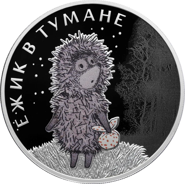The reverse shows the film's main character standing on a hill against a foggy, laser-matte background, with the relief inscription ‘ЕЖИК В ТУМАНЕ’ around the upper left circumference.