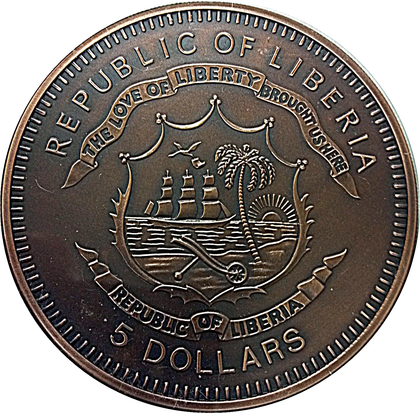Liberian coat of arms with denomination below.