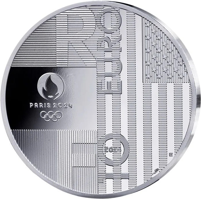 USA and French flags flanking "10 EURO," with Olympic rings and Paris 2024 logo.