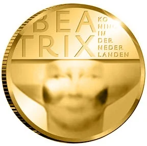 Sculptural effigy of Queen Beatrix, crowned by the inscription "BEATRIX KONINGIN DER NEDERLANDEN".
