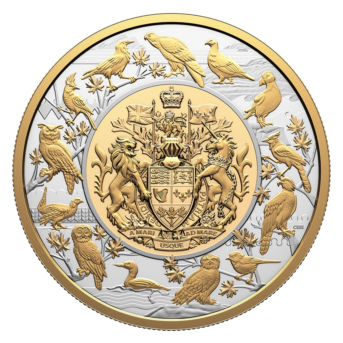 The coin's reverse presents a redesigned Canadian Coat of Arms, encircled by provincial and territorial birds and heraldic symbols arranged counter-clockwise from west to east and across the north. These include: Steller’s jay (BC); engraved line (Pacific); dancetty line (Rockies); great horned owl (AB); invected line (coulee hills); wheat pattern (prairies); sharp-tailed grouse (SK); great grey owl (MB); common loon (ON); wavy bars (Great Lakes/Shield); snowy owl (QC); black-capped chickadee (NB); nebuly line (Bay of Fundy); osprey (NS); blue jay (PE); Atlantic puffin (NL); crested wavy line (Atlantic coast); rock ptarmigan (NU); barred pattern (Arctic Ocean); gyrfalcon (NT); and common raven (YT).
