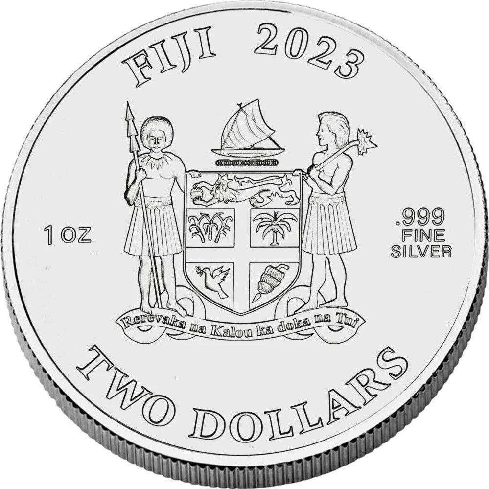 Description: Fiji's coat of arms features a quartered shield displaying sugar cane, a coconut palm, a dove with an olive branch, and bananas. A lion holding a cocoa pod tops the shield, which is crowned by an outrigger canoe and supported by two Fijian figures.