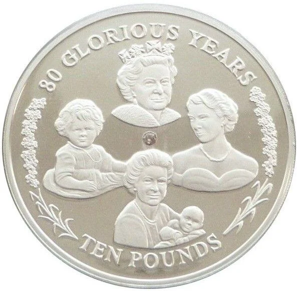 Diamond encircled by four Queen Elizabeth II busts, surrounded by a wreath.