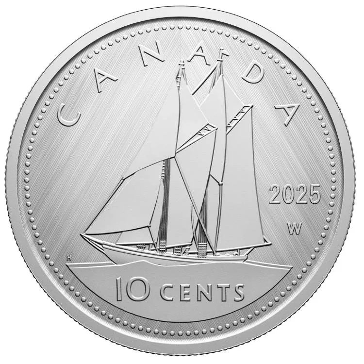 A silver tribute to Canada’s 10-cent piece, featuring Emanuel Hahn’s Bluenose schooner and the Winnipeg “W” mint mark.