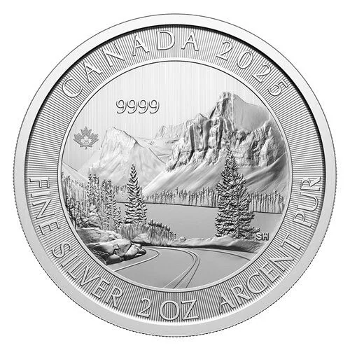 Crowfoot Mountain in Banff National Park overlooks Bow Lake's blue waters, with a micro-engraved "25" maple leaf marking the coin's issue year.
