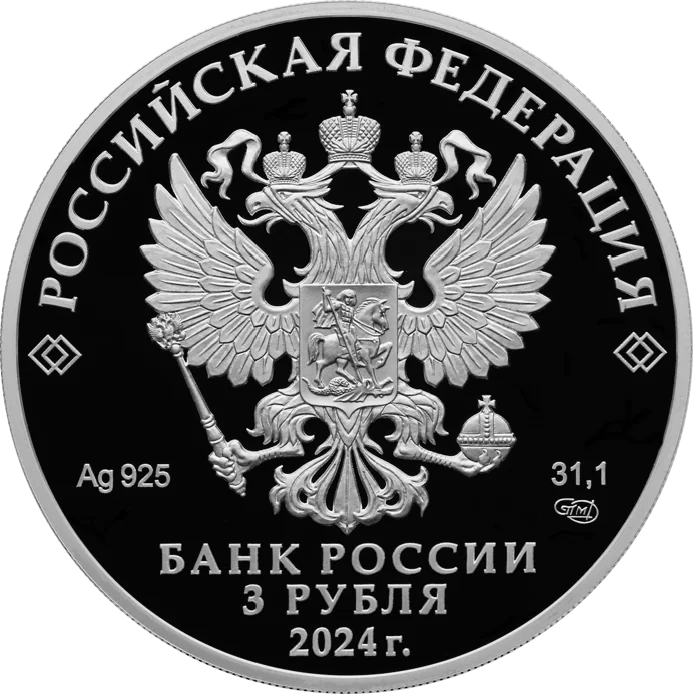The obverse features the Russian Federation coat of arms, inscriptions for 'RUSSIAN FEDERATION' and 'BANK OF RUSSIA', '3 RUBLES', '2024', the metal's chemical symbol, fineness, the mint mark, and fine metal content.