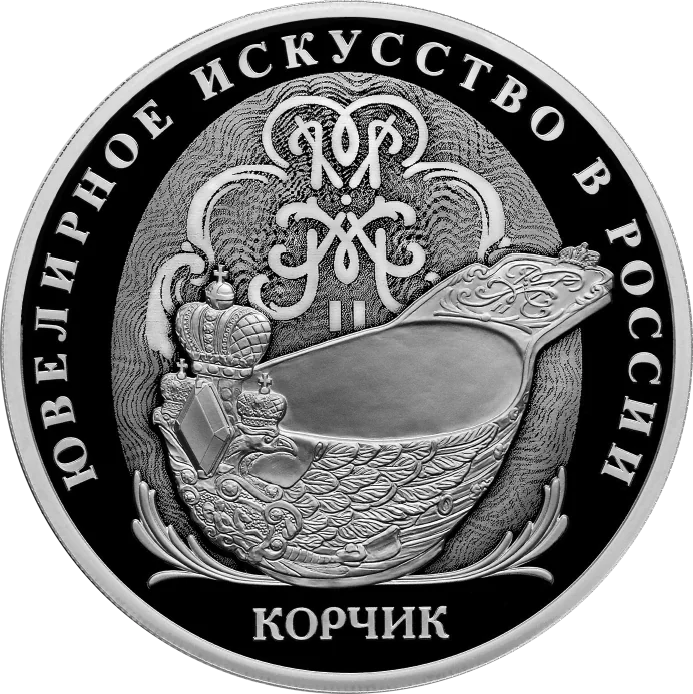 A matte, egg-shaped background with Nicholas II's monogram frames a relief image of a Fabergé silver scoop. Ornamental relief borders the bottom, with "ЮВЕЛИРНОЕ ИСКУССТВО В РОССИИ" above and "КОРЧИК" below.