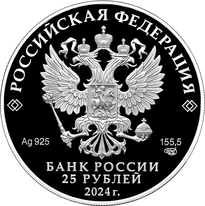 The coin's obverse features the Russian Federation coat of arms, along with inscriptions for the country, the Bank of Russia, the denomination '25 RUBLES', the year 2024, the metal's chemical symbol, fineness, mint mark, and fine metal content.