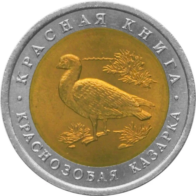 Center disc: relief of a Red-Breasted Goose. Outer ring: "КРАСНАЯ КНИГА" (RED DATA BOOK) above and "КРАСНОЗОБАЯ КАЗАРКА" (RED-BREASTED GOOSE) below, separated by dots.