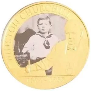 The coin features Churchill at his desk, pen in hand, while the photograph shows him as a boy.