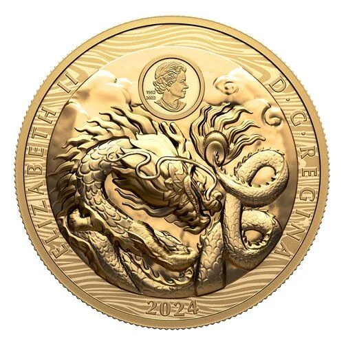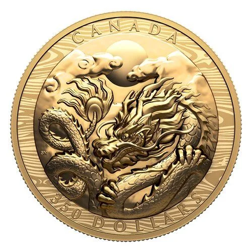 Simon Ng's reverse design marks 2024 as the Year of the Wood Dragon. Framed by a laser-engraved Wood element pattern, the Dragon moves through a moonlit night sky, its tail coiled to form the lucky number 8.
