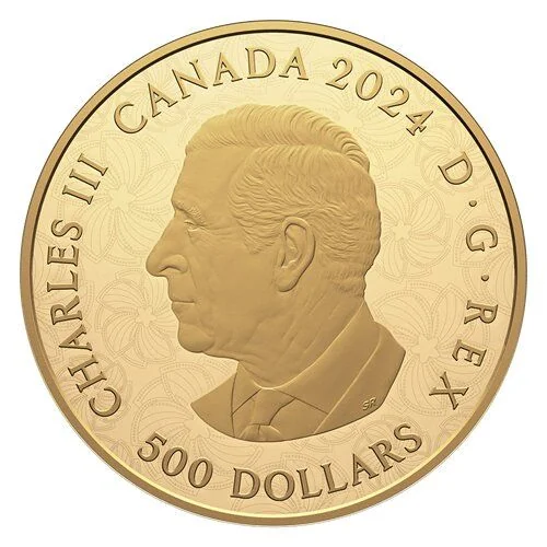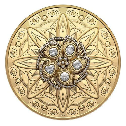 The reverse features a fusion of past Purely Brilliant coin designs, inspired by five Ideal Cut diamond shapes. These five 0.6-carat Canadian diamonds, set in a 24-karat gold mount, are each encircled by 0.4 carats of decorative diamonds, totaling 3.4 carats.