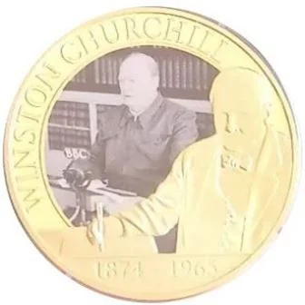The coin features Churchill at his desk, pen in hand, preparing his 1942 BBC speech.
