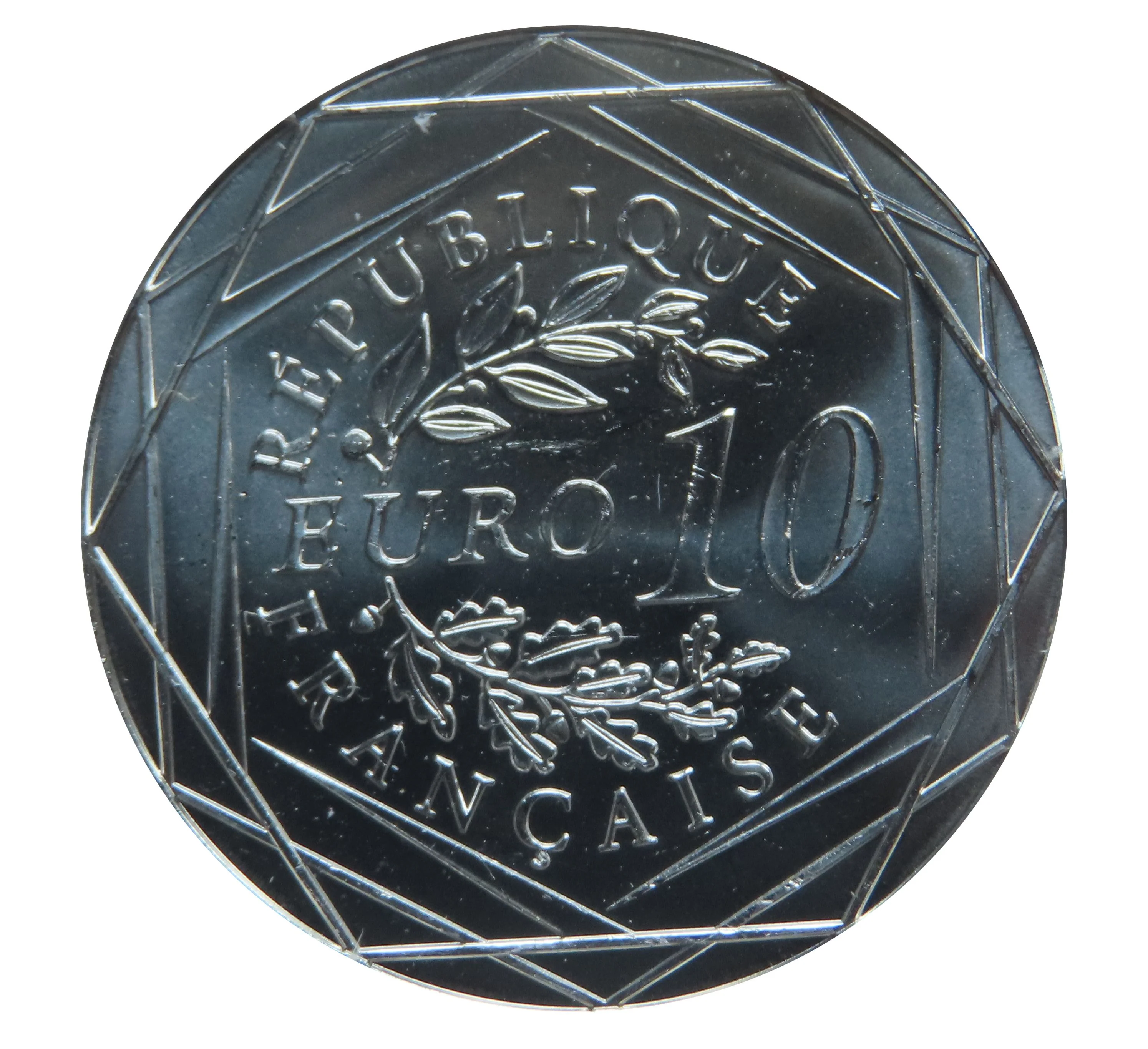 "10 EURO" flanked by laurel and oak branches, encircled by "RÉPUBLIQUE FRANÇAISE" and three hexagons.
