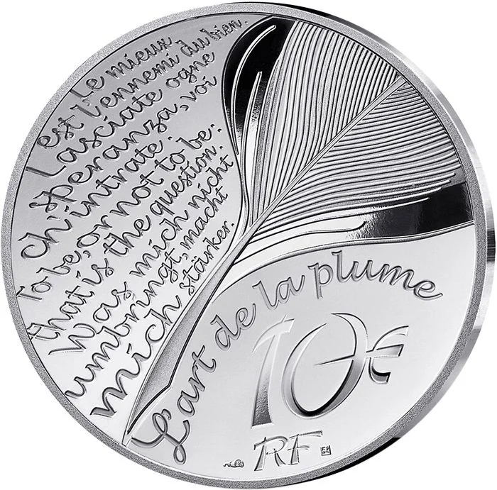 Feather, face value, and emblematic quotations from Voltaire, Dante, Shakespeare, and Nietzsche.