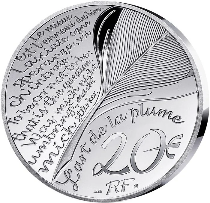 Feather, face value, and emblematic quotations from Voltaire, Dante, Shakespeare, and Nietzsche.