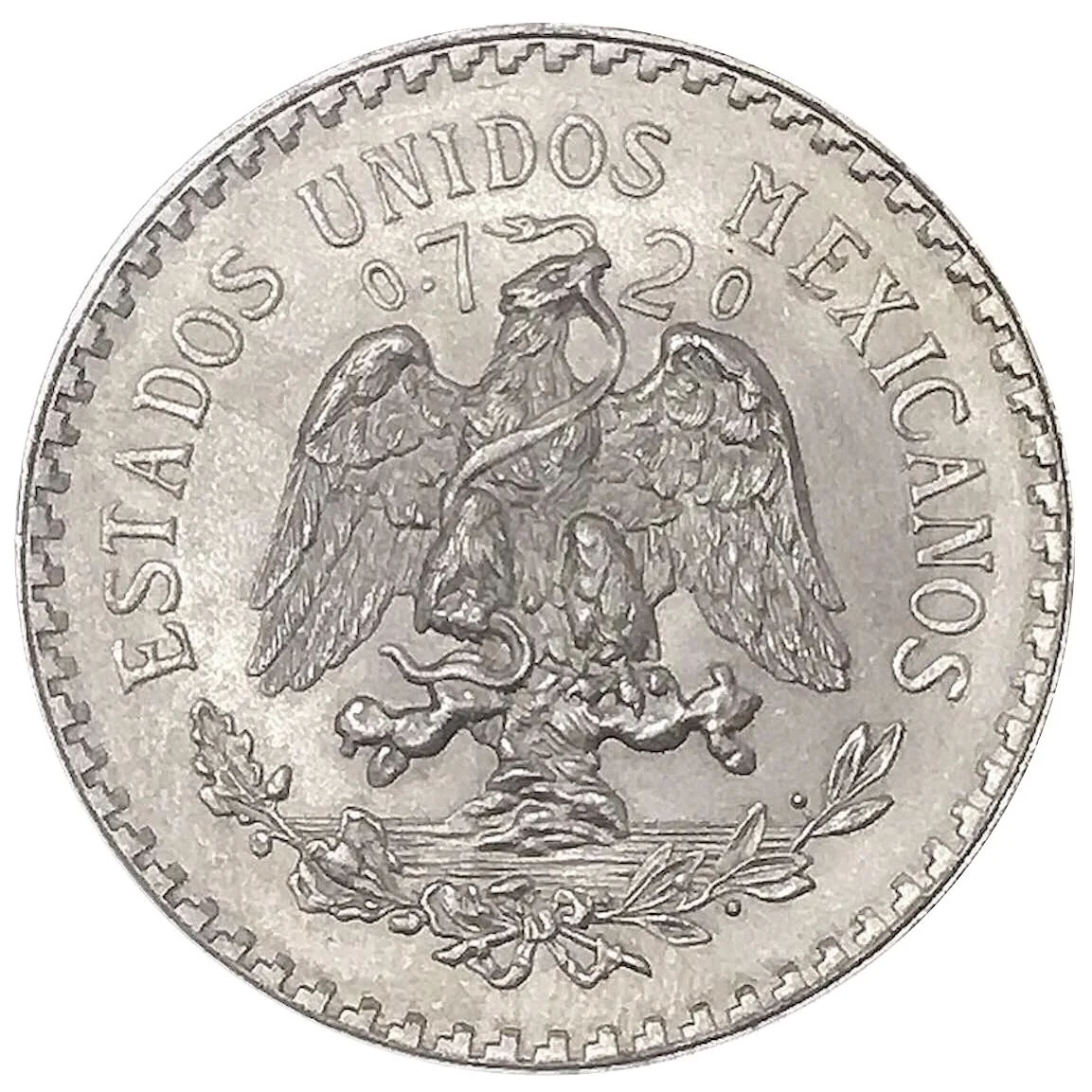 The Mexican coat of arms features a golden eagle on a prickly pear cactus, devouring a rattlesnake. It is flanked by an encina branch and a laurel branch, with the eagle's head separating the purity mark (0.720). "ESTADOS UNIDOS MEXICANOS" is inscribed above.