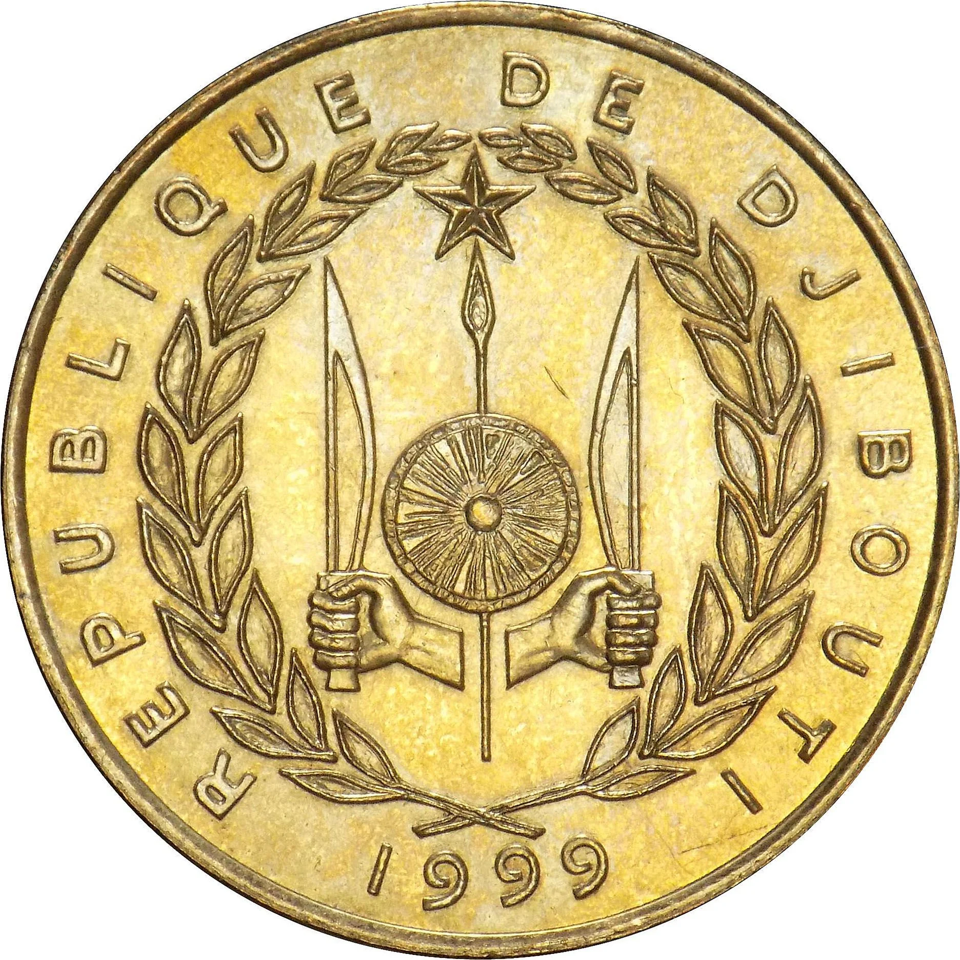 A laurel wreath encircles Djibouti's arms—two fists holding a knife, a spear with a shield, and a star—with the date below.