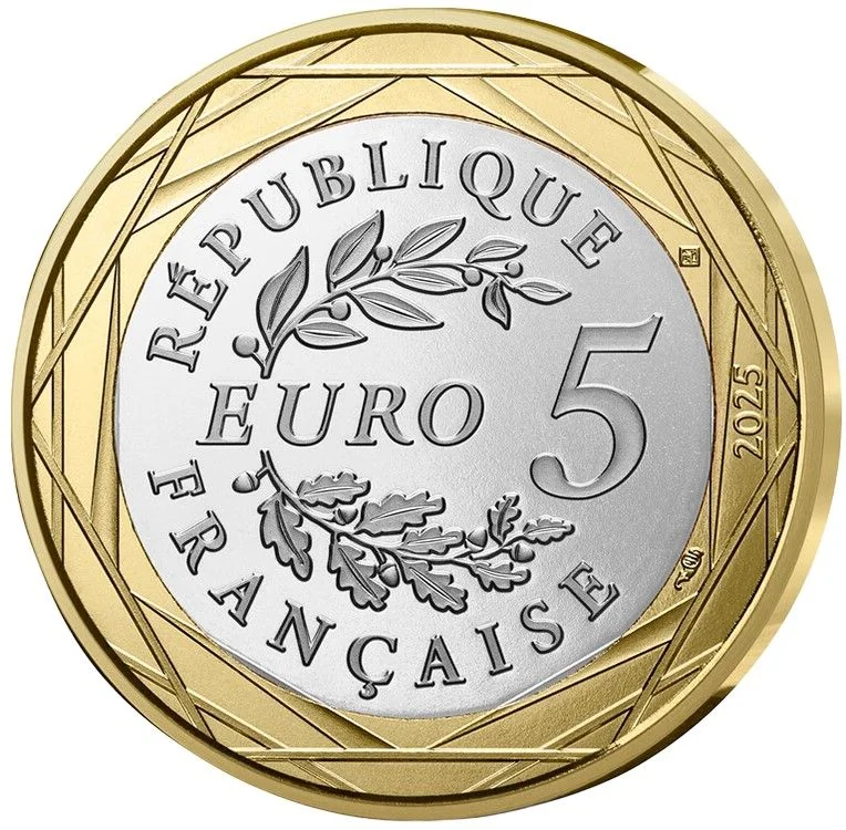 Face value flanked by oak and laurel branches, suggesting the Euro symbol. The design is framed by "RÉPUBLIQUE FRANÇAISE" and lines forming the Hexagon.