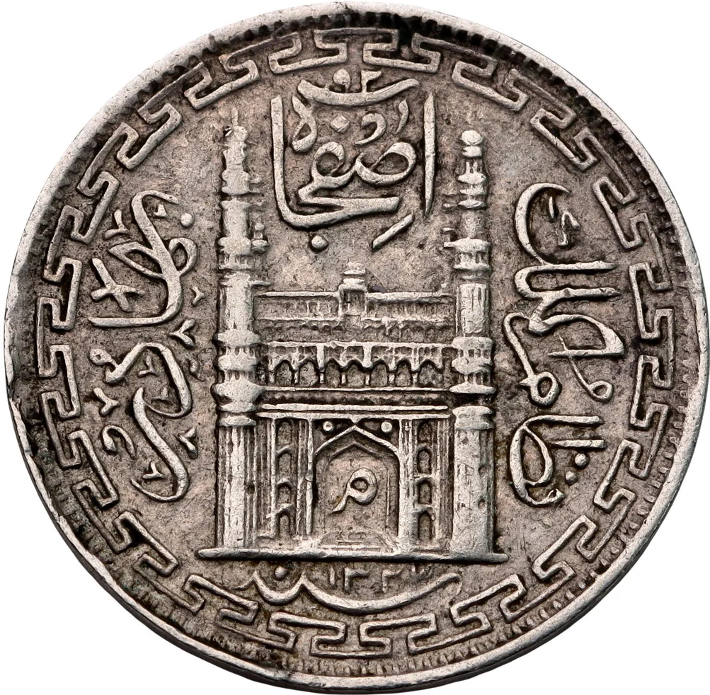 CharMinar gateway legend: Asaf Jah (top), Bahadur (left), Nizam Al-Mulk (right). Urdu "Mim" (for "Mahbub") in doorway. AH date below.