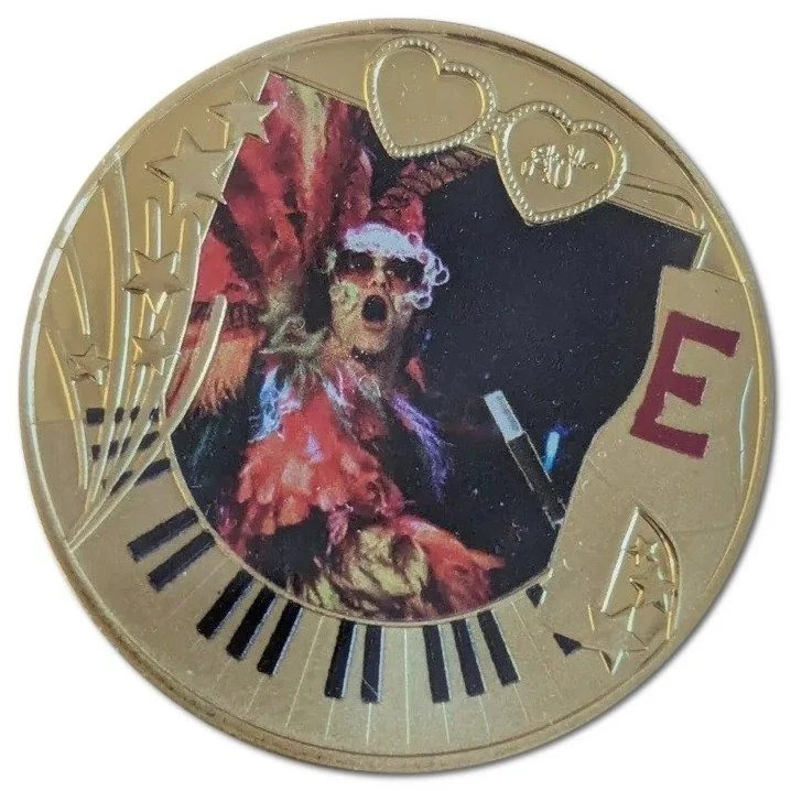 Elton John in costume, with his signature above and a piano keyboard below.